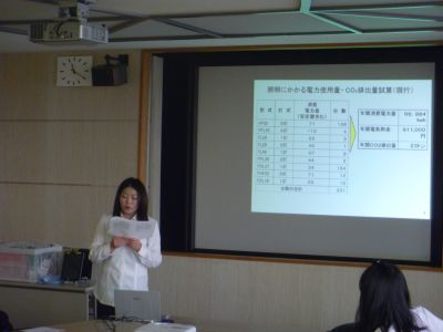 今回のプレゼンテーションでは、6月6日に行った照明設備の現地調査を基に、現行の消費電力量、電気料金、二酸化炭素排出量を算出し、LED照明を導入することでこれらがどの程度改善されるのかをシミュレーションした結果を報告いたしました。